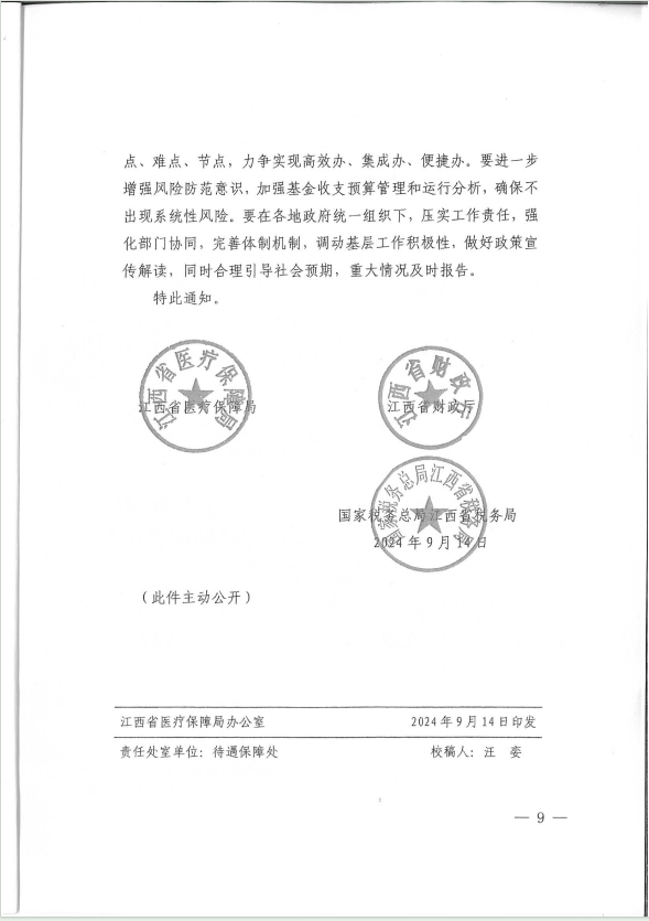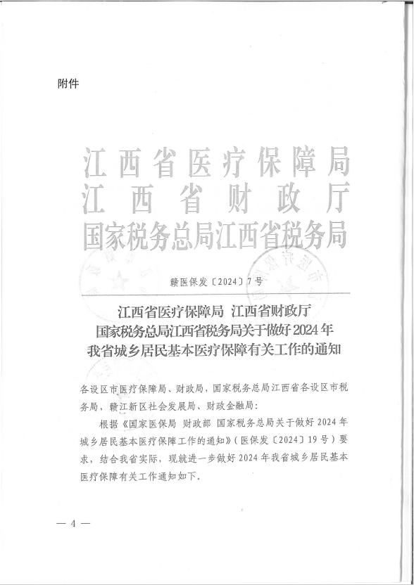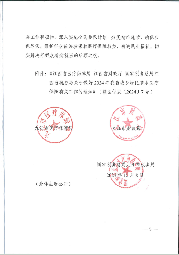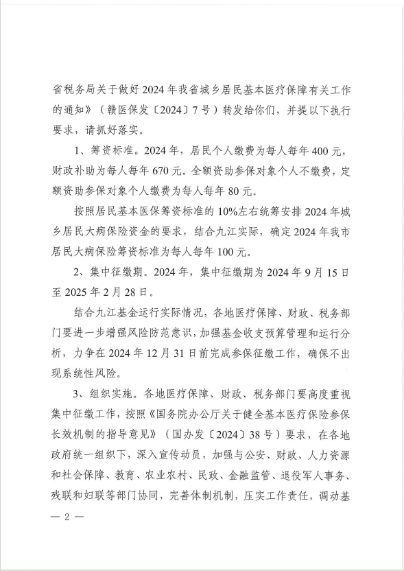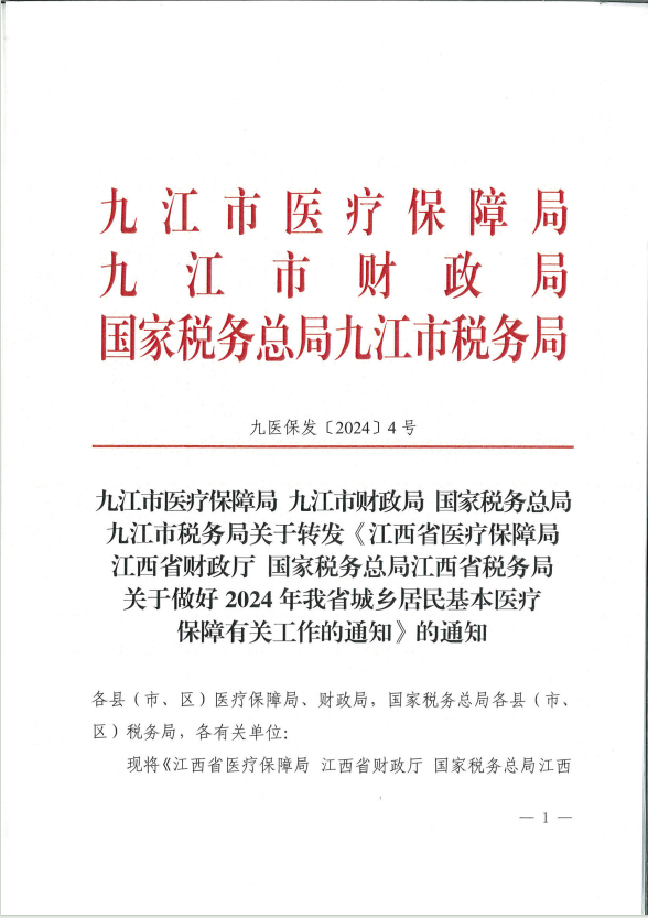 关于转发《江西省医疗保障局 江西省财政厅国家税务总局江西省税务局关于做好2024年我省城乡居民基本医疗保障有关工作的通知》的通知(九医保发〔2024〕4号)