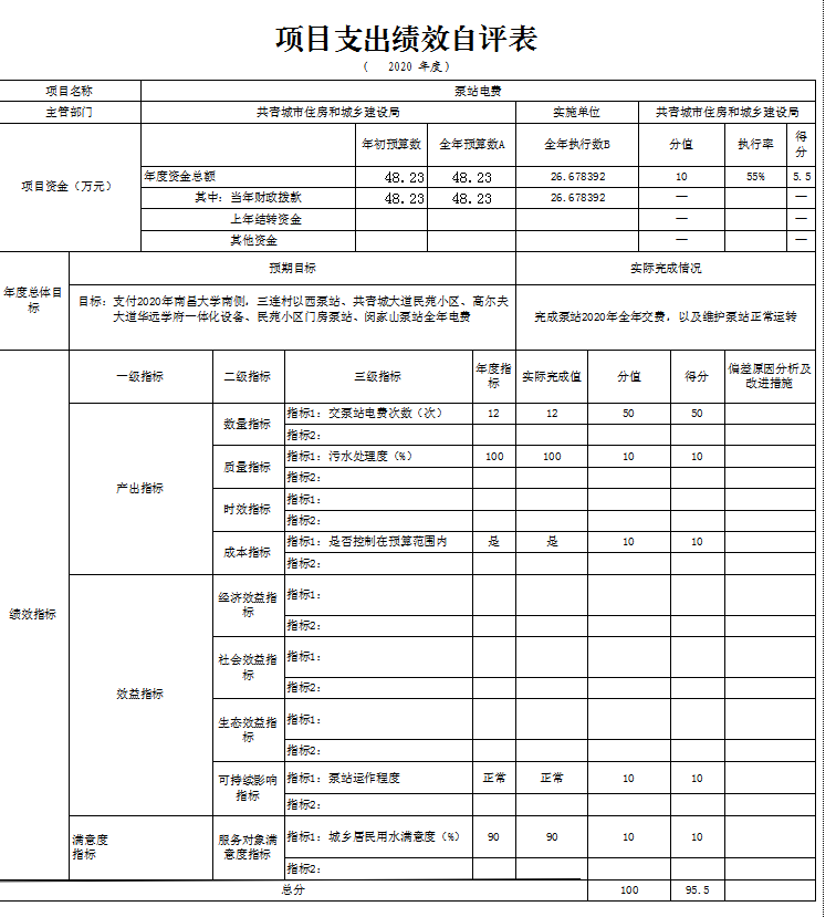 泵站电费项目绩效自评综述:根据年初设定的绩效目标,泵站电费项目绩效自评得分为 95.5分。项目全年预算数为48.23万元,执行数为26.68万元,完成预算的55%。主要产出和效果:一是数量指标泵站电费缴纳次数12次;二是控制在预算范围内;三是泵站运作正常。发现的问题及原因:执行数与预算数还是有差额。