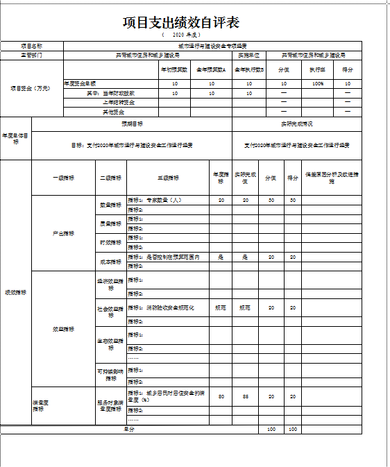 城市运行与建设安全专项经费项目绩效自评总体综述:根据年初设定的绩效目标,城市运行与建设安全专项经费项目绩效自评得分为 100 分。项目全年预算数为10万元,执行数为10万元,完成预算的 100 %。项目绩效目标完成情况:一是聘请专家数量20人;二是控制在预算范围内。发现的问题及原因:本次绩效评价指标体系在吸收、借鉴以前年度工作成果的基础上进行了一些改进,但个别绩效指标仍需要深入研究,进一步细化、量化。下一步改进措施:加大绩效评价工作推进力度。将绩效评价纳入中心的常态工作来抓,早安排、早落实。加强绩效评价人员的培训,强化绩效评价人员业务知识,提高绩效评价工作质量。