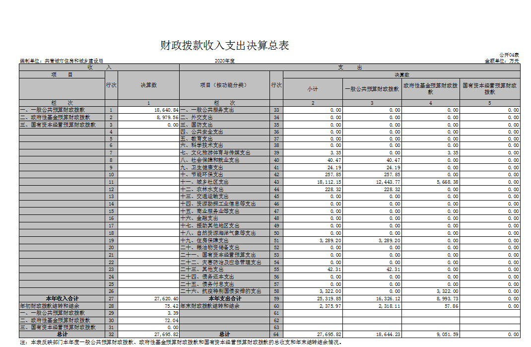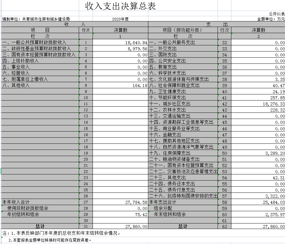 本部门2020年度支出总计 27860万元,其中本年支出合计 25484.03 万元,较2019年减少3078.57万元,下降10.78 %,主要原因是:2020年项目减少,支出减少;年末结转和结余2375.97万元,较2019年增加1315.37万元,增长124 %,主要原因是:涉及项目跨年,存在上级专项资金未支付。