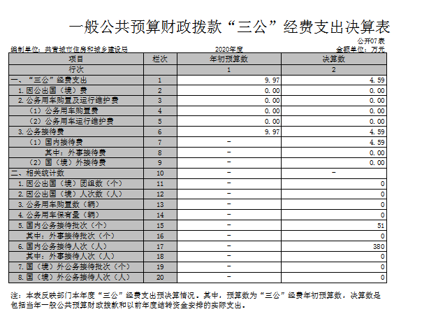 (二)公务接待费支出年初预算数为 9.97万元,决算数为 4.59 万元,完成预算的46.04 %,决算数较2019年减少4.02万元,下降46.69%,全年国内公务接待 51 批,累计接待380 人次。主要原因是:2020年公务接待减少。