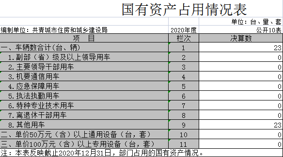 截止2020年12月31日,部门账面共有车辆23辆,其中,一般公务用车 0辆,执法执勤用车 0 辆,其他用车23辆。
