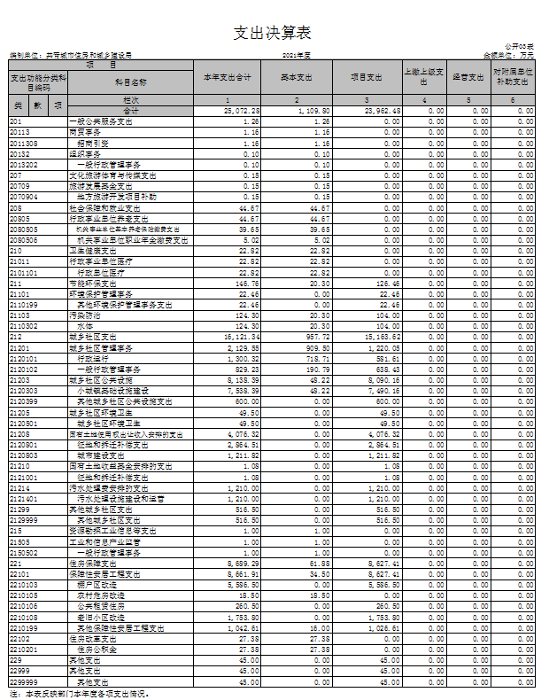 本部门2021年度支出总计 25072.28万元,其中本年支出合计25072.28万元,较2020年减少411.75万元,下降1.6 %,主要原因是:2021年项目减少,支出减少;年末结转和结余0万元,较2020年减少2375.97万元,减少100 %,主要原因是:年末未使用资金全部收回。