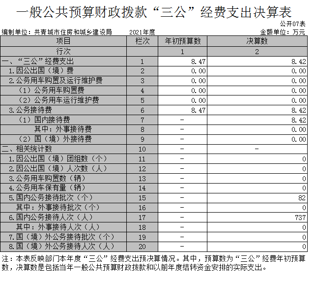 (二)公务接待费支出年初预算数为 8.47万元,决算数为 8.42 万元,完成预算的99.4 %,决算数较2020年增加3.83万元,增长83.44%,全年国内公务接待 82 批,累计接待737 人次。主要原因是:2021年公务接待增加。