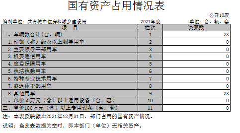 截至2021年12月31日,部门账面共有车辆23辆,其中,一般公务用车 0辆,执法执勤用车 0 辆,其他用车23辆。