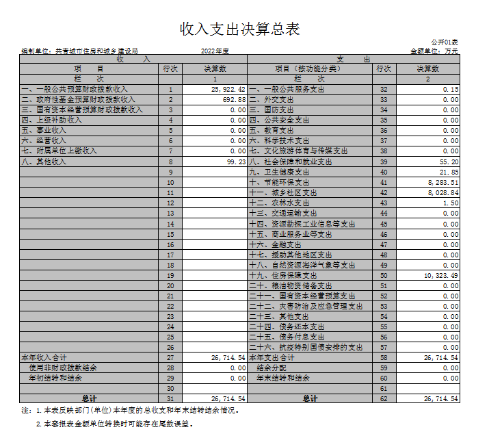 本部门2022年度收入总计 26714.54万元,其中年初结转和结余 0万元,较2021年减少1614.78万元,下降100 %;本年收入合计 26714.54万元,较2021年增加3257.03万元,增长13.88%,主要原因是:2022年无年初结转和结余收入,本年项目收入增加。