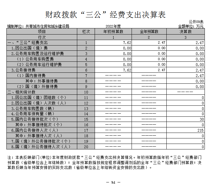 (二)公务接待费支出全年预算数为 7.62 万元,决算数为2.47万元,完成全年预算的32.41%,决算数较2021年减少5.95万元,下降70.66%,主要原因是2022年疫情影响,公务接待减少。决算数较全年预算数减少的主要原因是:2022年公务接待减少。全年国内公务接待30批,累计接待215人次,其中外事接待 0批,累计接待0人次,主要为:正常公务接待。