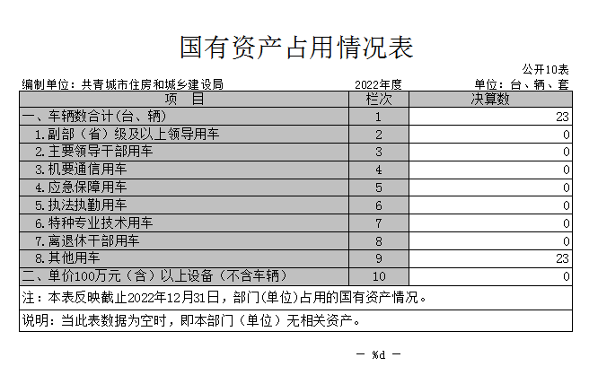 截止2022年12月31日,本部门(单位)国有资产占用情况见公开10表《国有资产占用情况表》。本部门账面共有车辆23辆,其中一般公务用车 0辆,执法执勤用车 0 辆,其他用车23辆。其中车辆中的其他用车主要是以前单位未分家前城管、环保使用车辆挂我局账。