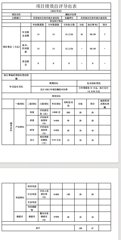 组织对“泵站电费及日常维护保养费”、“城区生活污水处理厂污泥处理费”等12个项目开展了部门评价,涉及一般公共预算支出389.32万元,政府性基金预算支出 0万元,国有资本预算支出0万元。从评价情况来看,评价情况来看,支付全市5处污水泵站2022年电费及泵站正常运行维护和保养费用;保障2022年保障性住房工作和审计顺利开展;维护单位稳定,保障单位正常运转开支;保障2022年防涝工作的顺利开展;保障2022年工程决算、测绘评估工作的开展;维护2022年房地产信息系统安全运行;支付危房改造、城乡环境整治、重大项目建设工作的日常开支;治理全市扬尘,污水所产生的污泥费;支付消防验收聘请专家费用;保障老旧小区改造、房屋拆迁的顺利进行。
