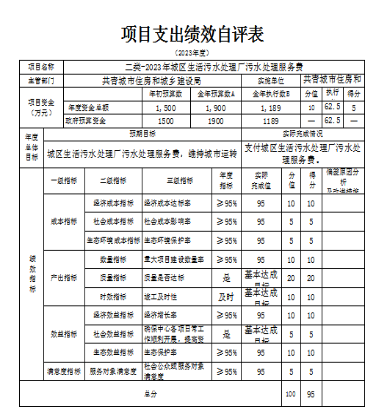 城区生活污水处理厂污水处理服务费项目绩效自评总体综述:根据年初设定的绩效目标,城区生活污水处理厂污水处理费项目绩效自评得分为95分。项目全年预算数为1500万元,执行数为1189万元,完成预算的 79%。项目绩效目标完成情况:一是完成2023年污水的处理;二是控制在预算范围内。发现的问题及原因:本次绩效评价指标体系在吸收、借鉴以前年度工作成果的基础上进行了一些改进,但个别绩效指标仍需要深入研究,进一步细化、量化。下一步改进措施:加大绩效评价工作推进力度。将绩效评价纳入中心的常态工作来抓,早安排、早落实。加强绩效评价人员的培训,强化绩效评价人员业务知识,提高绩效评价工作质量。