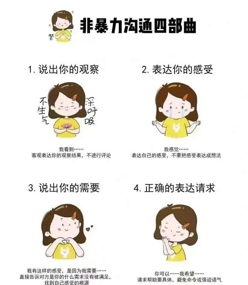春节期间,和长辈相处的时间多了,面对长辈亲友的“关心”,同学们不妨幽默地转移话题,也可以化被动为主动,比如可以主动谈谈自己这一学期的心得体会,并且总结自己的不足,分享一下自己下一阶段的规划等,同时也可以请教长辈,听听长辈丰富的人生阅历,给自己提建议,增进彼此的心理距离。遇到冲突时,尝试学会用恰当地方式去交流和表达。避免情绪性对话,也可以尝试“非暴力沟通”: