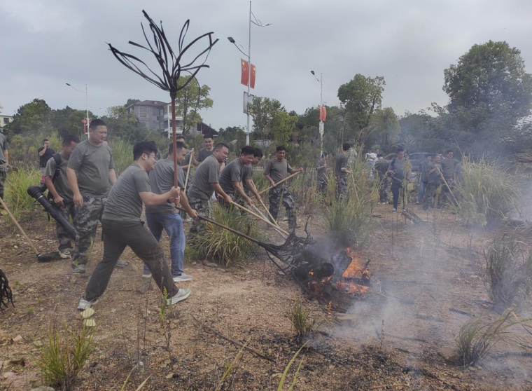 “报告!乡政府以东、中心幼儿园以西荒地处发生火情,请立即处置!”指令下达后,应急队伍闻令而动,携带灭火装备徒步奔赴火情点,反应迅速、秩序井然,展现出高效的快速响应能力。