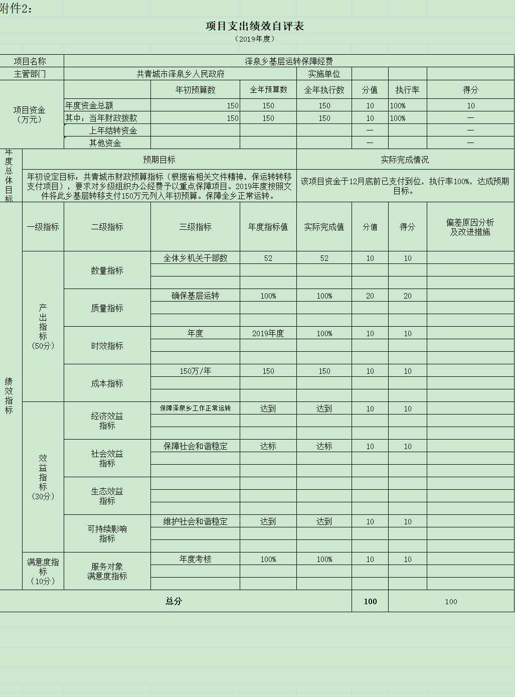 附加详见:《泽泉乡基层组织运转保障经费项目支出绩效自评表》