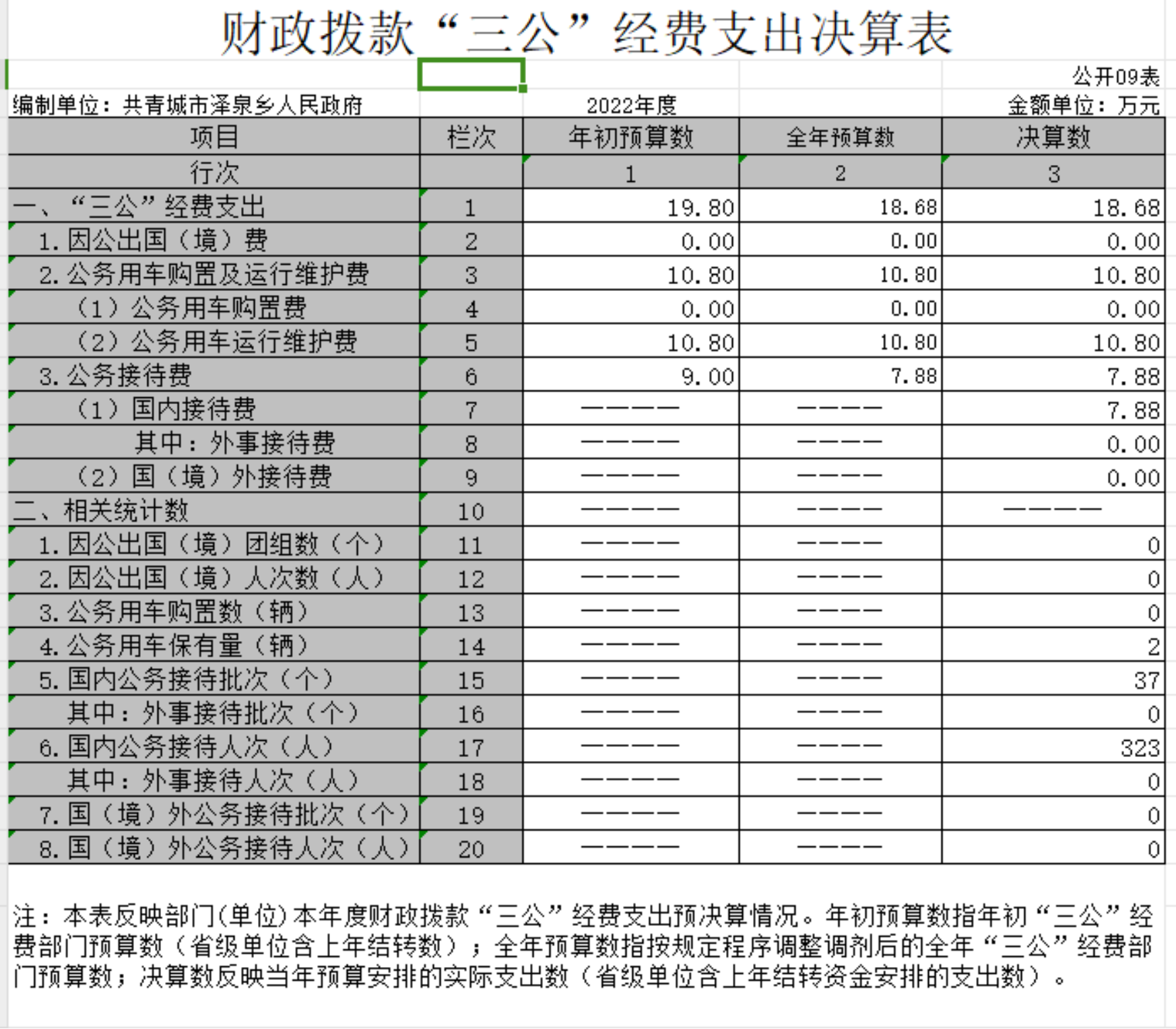 (十)“三公”经费支出:指用一般公共预算财政拨款安排的因公出国(境)费、公务用车购置及运行维护费和公务接待费。其中,因公出国(境)费反映单位公务出国(境)的国际旅费、国外城市间交通费、住宿费、伙食费、培训费、公杂费等支出;公务用车购置及运行维护费反映单位公务用车车辆购置支出(含车辆购置税、牌照费),按规定保留的公务用车燃料费、维修费、过桥过路费、保险费、安全奖励费用等支出;公务接待费反映单位按规定开支的各类公务接待(含外宾接待)支出。