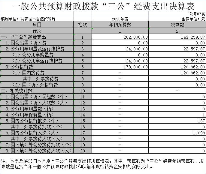 “三公”经费:反映财政拨款安排的因公出国(境)费、公务用车购置及运行费和公务接待费。其中,因公出国(境)费反映单位公务出国(境)的国际旅费、国外城市间交通费、住宿费、伙食费、培训费、公杂费等支出;公务用车购置及运行费反映单位公务用车车辆购置支出(含车辆购置税)及租用费、燃料费、维修费、过路过桥费、保险费、安全奖励费用等支出;公务接待费反映单位按规定开支的各类公务接待(含外宾接待)支出。