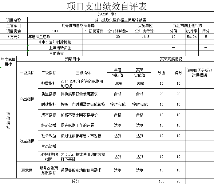 项目绩效自评总体综述:根据年初设定的绩效目标,城市规划矢量数据坐标系转换费项目绩效自评得分为90分。项目全年预算数为30万元,执行数为16.8万元,完成预算的56%。项目绩效目标完成情况:一是转换成果符合使用要求;二是按照工作时间需要完成转换;三是价格不高于国家指导价。发现的问题及原因:一是预算数远远大于实际执行数,原因申报预算时未充分预估实际支出。下一步改进措施:申报预算时应提前充分询价。