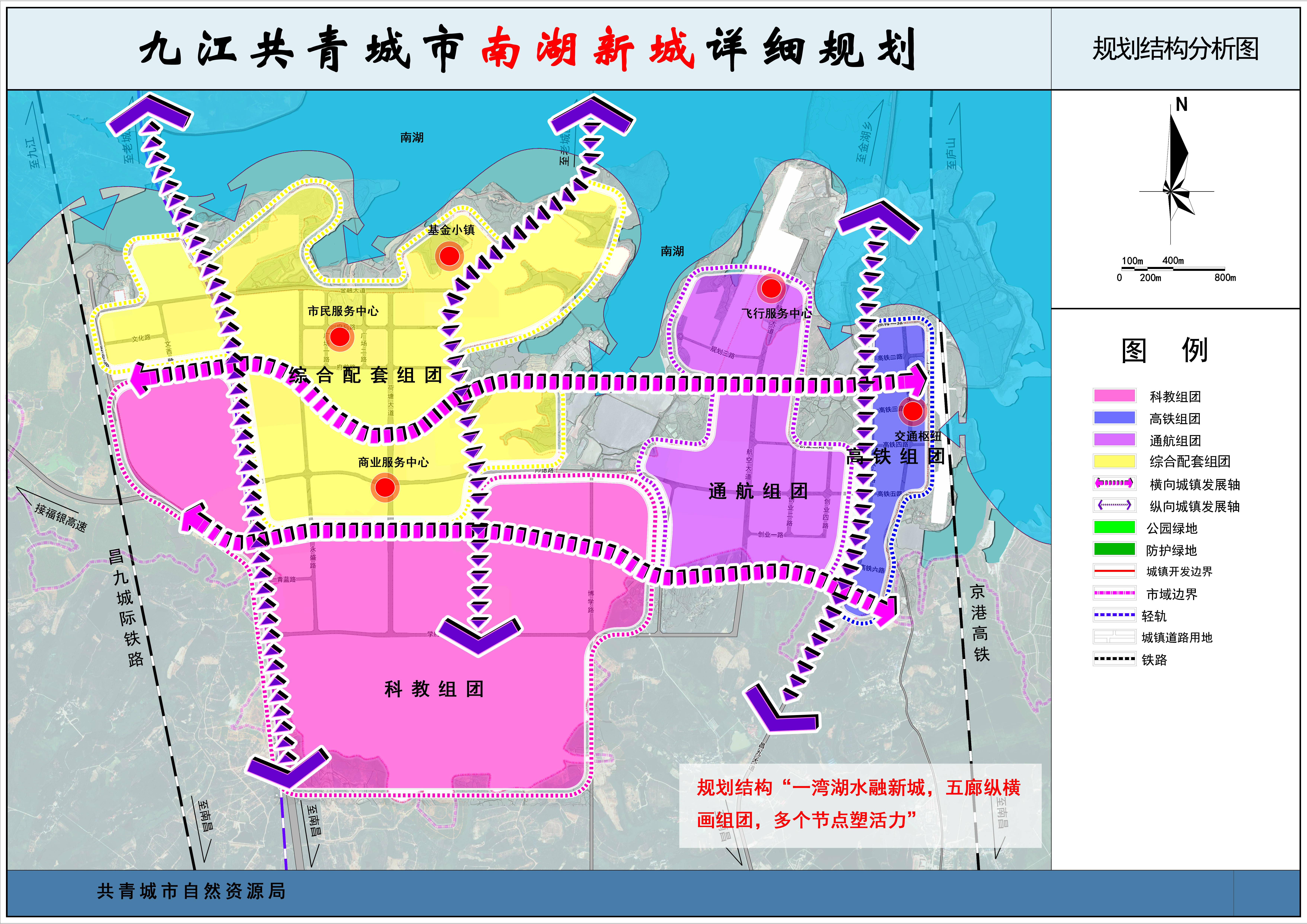 一湾湖水融新城:南湖新城滨水而立,规划强调滨湖城市功能和特色景观塑造,充分发挥“水”的生态、景观、交通等功能,将城市生活引向鄱阳湖,实现城市和滨湖区域的共同发展,构建滨湖城市活力中心。