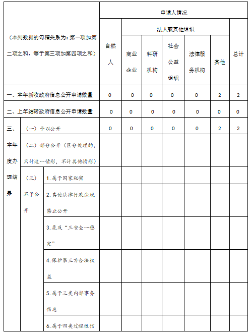 今年以来,我局受理信息公开申请2条,办理答复依申请公开信息2条。不存在不予公开政府信息情况,且未出现因政府信息公开申请行政复议、提起行政诉讼案件。
